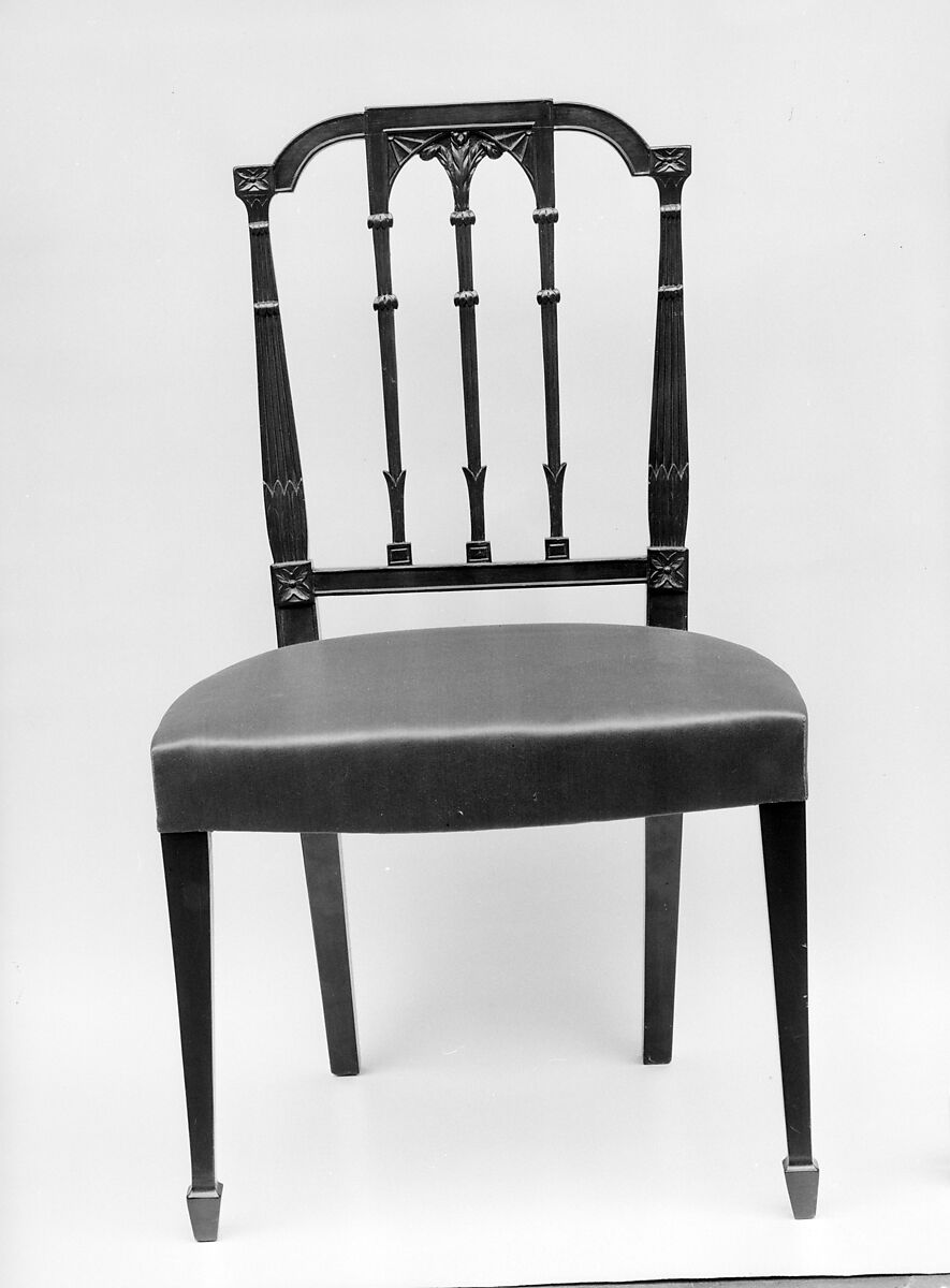 This square-back side chair exemplifies the proficient carving and square, tapered legs so often found in New York work. Similar chairs were shown in cabinetmakers' price books from New York in 1796 and 1802.