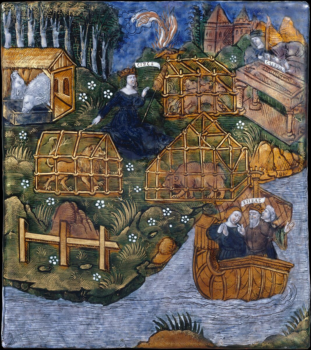 European of the Renaissance period viewed ancient Rome not only as the origin of Italian civilzation but also the geographic center of a lost golden age. This plaque belongs to a series of at least eighty Limoges enamels illustrating events from Virgil’s Aeneid. The Latin epic poem tells the story of the legendary hero Aeneas, who escaped the sack and burning of Troy by the Greeks and, after wandering for some time, settled in Italy, where his descendants founded Rome.