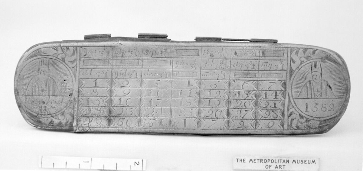 This is the cover only of a tobacco box, oblong with rounded ends. It is engraved with a perpetual calendar, flanked by leaf scrolls and two roundels. The roundel on the left shows a bust of Julius Caesar, inscribed: Voor krist 45 (45 B.C.). The right-hand medallion depicts Pope Gregory XIII and bears the date 1582. The lid carries a date on the bottom line of the calendar: 1729.