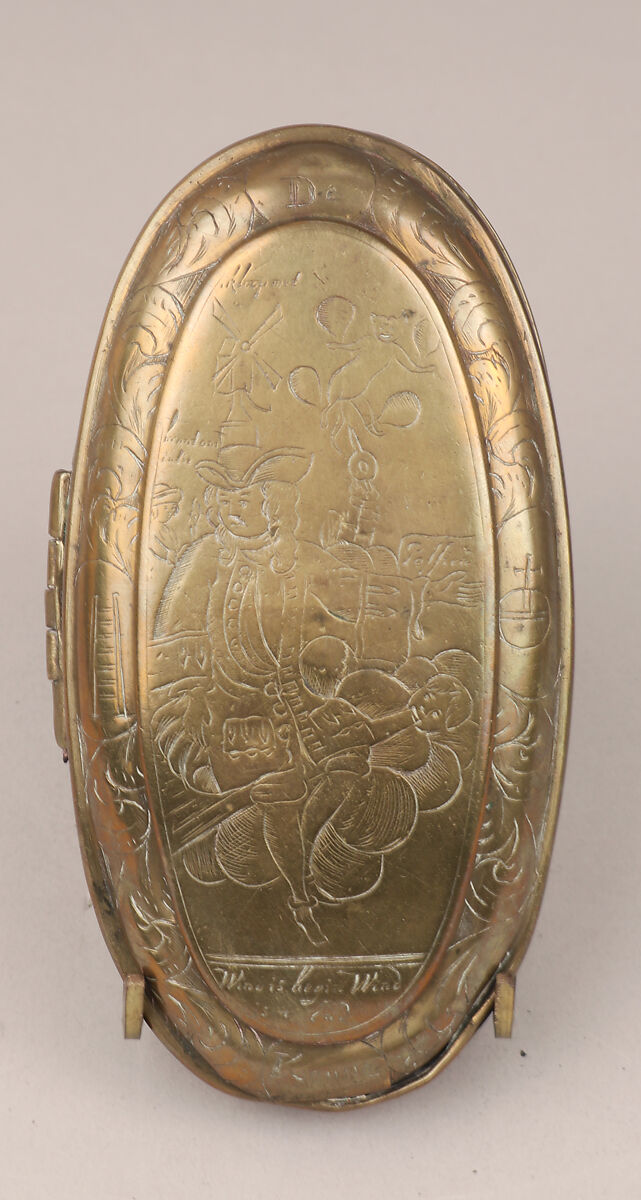 The box is oval.Rims are lined and edges molded. Leaf scrolls adorn the borders and sides, and in the center of the front side is an engraved ship. A full-length portrait of John Law, holding a document in his hand, is rendered on the lid. Inscribed below is: Heer Johan Louw (Mr. John Law). On the document is the word: Finantie (Finance). The border incorporates a rebus, the same one that appears on 57.108.24