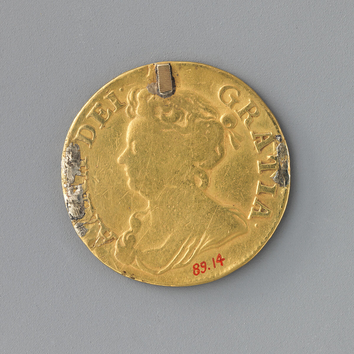 This Queen from the very beginning of her reign, restored by statute the standard of the coinage which had been woefully debased by her predecessors, William III and Mary; and her coins continued to the end of the reign to be famous for their beauty and fineness. The Museum example has been injured by clumsy efforts to attach it to some object.