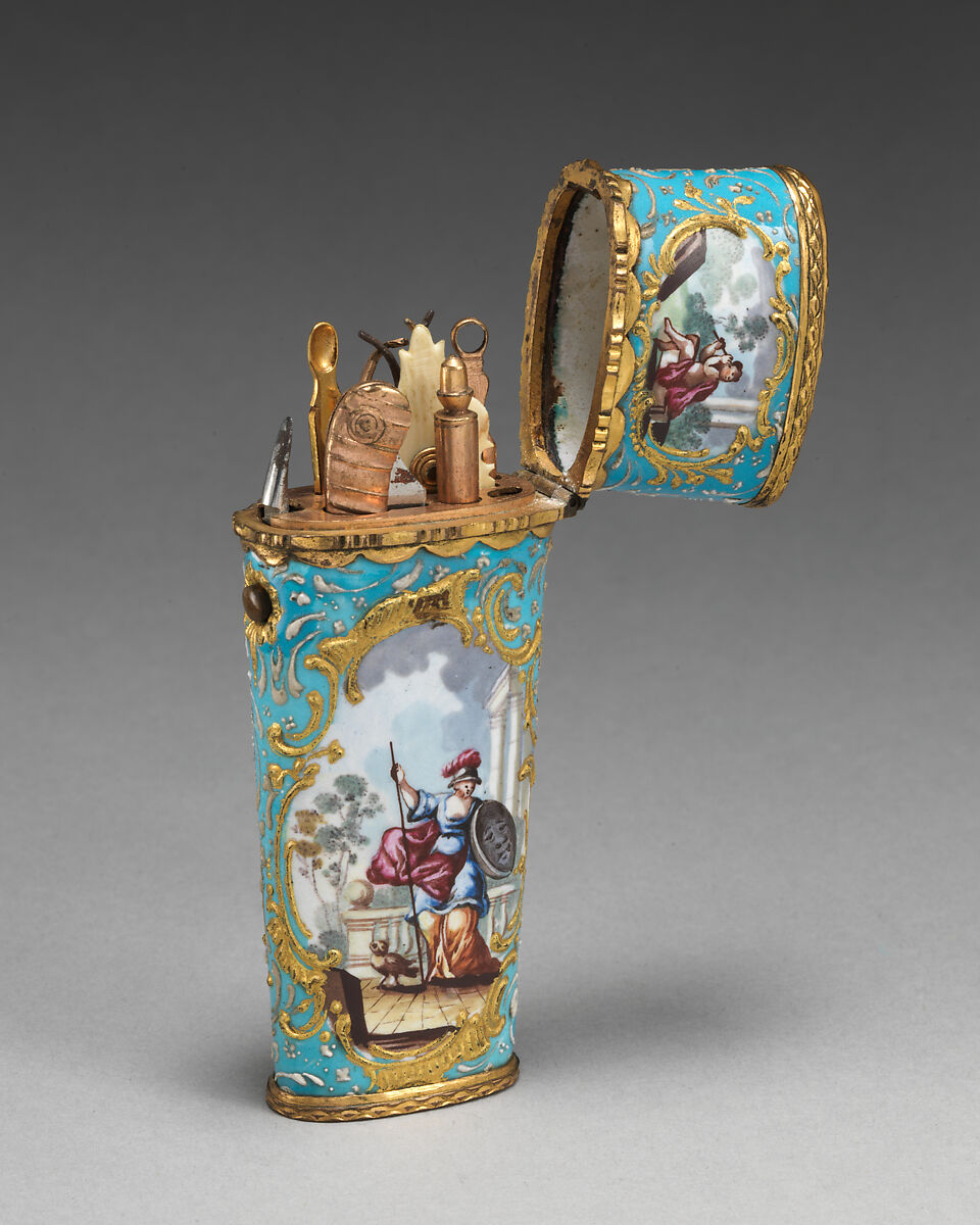 A variety of useful articles could be tucked away into the individual compartments inside an étui, a portable container that served the same function as a nécessaire. This case contains a penknife, scissors, two ivory tablets for jotting down notes, tweezers, a toothpick (its handle also functioning as an ear scooper), and a pencil handle.