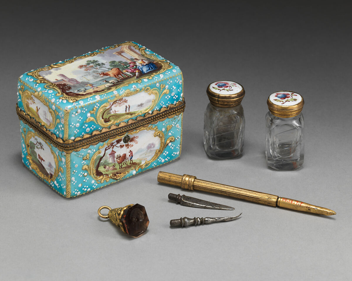 A variety of useful articles could be tucked away into the individual compartments inside a nécessaire, or a portable container that served the same function as an étui. This case holds essential items for writing: an inkwell, a pounce pot (containing pounce, a powder that smoothed rough paper or dried wet ink), a fob seal depicting a bust in profile (onto which wax would be melted to seal letters), and a handle to which various implements—a pen nib, knife blade, and ink scraper/eraser—could be attached.