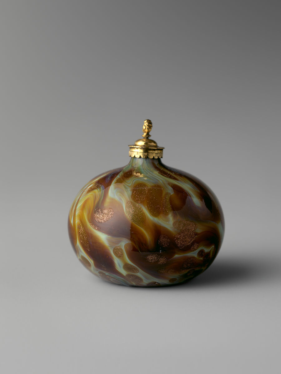 The “chalcedony” glass of thid delicate object mimics the banded, multicolored agate stone of the same name. The technique involves the addition of several metallic oxides into a glass batch that is intentionally left poorly mixed, resulting in streaky veins of color. The perfume bottle has additional splashes of glittering aventurine glass, made from copper crystals that form as the glass cools. Since the crystals can diminish with reheating, aventurine was usually incorporated as small spots dotting the surface of a vessel.