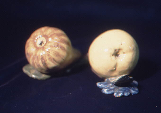 This is one of a set of twelve (see 94.4.38–.49) Delftware polychromed figures in the shapes of fruit including apples, figs, lemons, and pears.