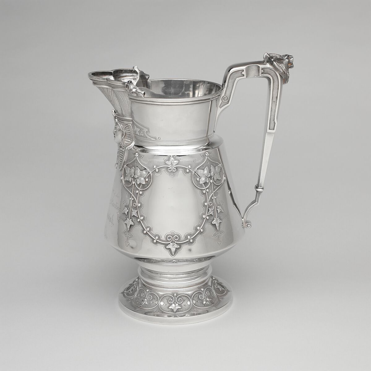 American silver holloware in the Egyptian Revival style is extremely rare. This stately pitcher incorporates Egyptian motifs into a classic form. The dynamic composition achieves a sophisticated expression of the prevailing taste for Egyptian-inspired designs. At the time this pitcher was created, the German-trained silversmith John Rudolph Wendt was Ball, Black & Co.’s primary designer and supplier, and the pitcher exemplifies the outstanding quality for which he is known. Located in a grand marble building boasting large display windows facing Broadway, Ball, Black & Co. was a leading silver retailer and a popular destination for shoppers and window shoppers alike.