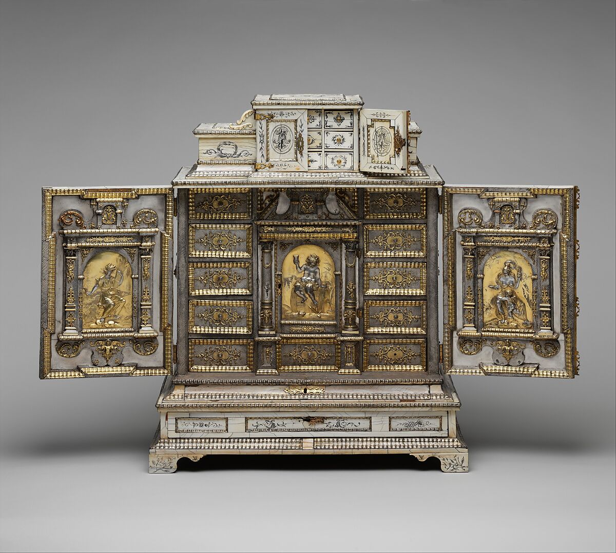 Some collectors of small objects commissioned elaborate cabinets decorated with semiprecious stones or exotic woods, such as ebony (see 1975.367), or other sumptuous material. These pieces were furnished with many drawers and secret compartments, which offered diverse storage opportunities. Some were designed to stand against a wall in the company of other display cases. Others stood independently, like the Metropolitan's example, which is finished on all sides; this type of cabinet could be said to represent in miniature format an entire Kunstkammer, which was itself a metaphor for the known world in all its diversity.