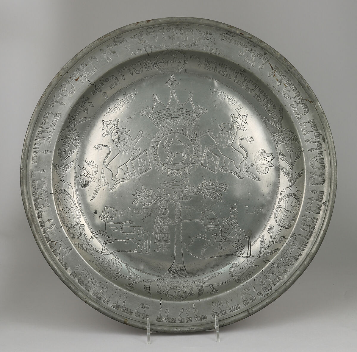 The names of the owners in Hebrew [translated as “Katz”] appear above the date, translated to “in the year 1767.” The symbol of the two hands at the top shows that the owner was a descendent of the priestly class from the ancient Temple. The Hebrew verse around the plate's rim comes from a biblical verse in the Book of Isaiah 59:21. The drawing at the center depicts the biblical scene when Joab kills Absalom from 2 Samuel 18:9-14. The bull may be a reference to the zodiac sign for Taurus corresponding to the Hebrew month Iyar in which the owner of plate might have been born