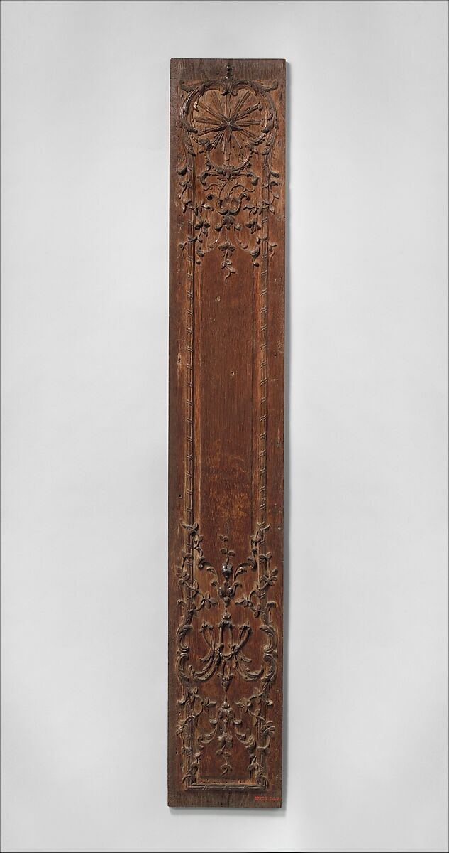 This pair of panels display symmetrical carving of scrolling acanthus leaves, C and inverted C scrolls as well as vines winding around an upright molding of tied fasces. A radiating star is carved near the top of each panel and the interlaced letters A and M, for Ave Maria (Hail Mary), on the lower half which strongly suggests an ecclesiastical context. Once painted and part of a larger decorative ensemble, these pieces were among the model collection of woodwork, paneling and seat furniture of Maison Leys, a successful decorating business, located at the Place de la Madeleine in Paris. Since 1885 the business was directed by Georges Hoentschel who installed the collection in 1903 in a museum-like display at Boulevard Flandrin, Paris. Three years later, Hoentschel sold the collection to J. Pierpont Morgan who gave the panels with the rest of the decorator’s seventeenth and eighteenth century objects to the Metropolitan Museum of Art in 1907.