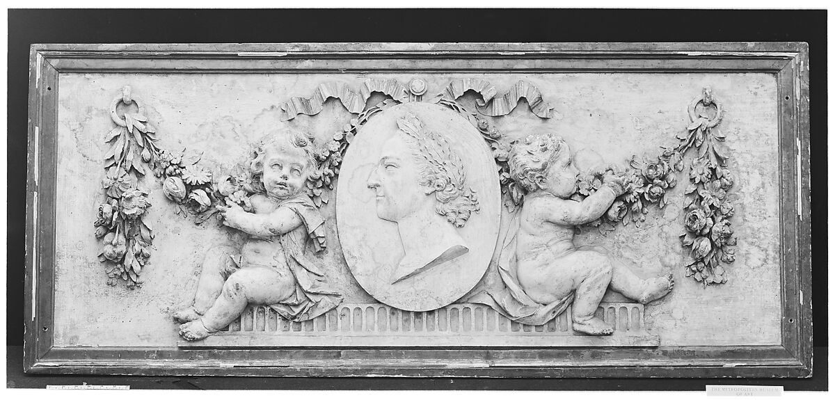 The medallion in the center of 07.225.101a is carved with a classicizing laureate profile portrait of Louis XV (1710–1774). This and a pendant overdoor, also in the Museum's collection, are said to come from the Château de Saint-Cloud, near Paris, which belonged to the Orléans family for most of the eighteenth century until 1785, when it was bought by Louis XVI as a present for Marie-Antoinette.