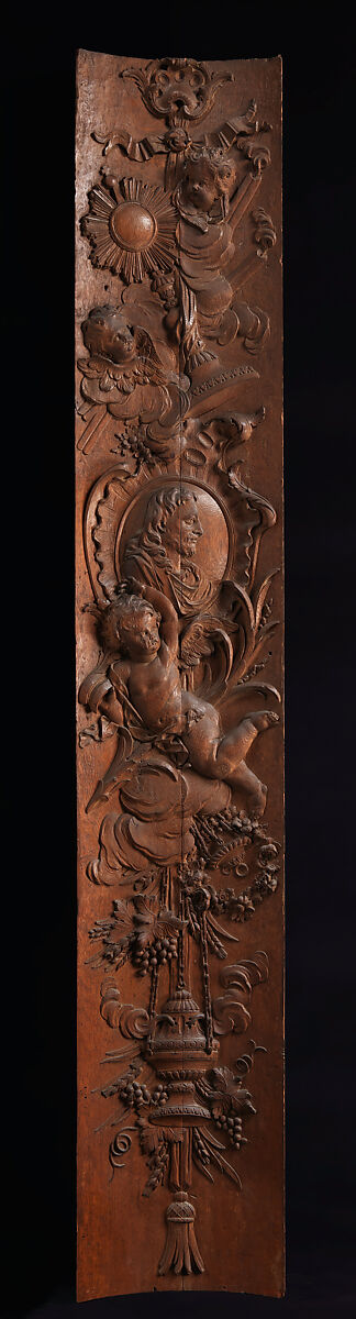 Carved with a trophy of religious attributes, the subtly curved surface of this panel and its pair (07.225.108.2) suggest their original placement in the corners of a room in an ecclesiastical setting. Suspended from a tasseled ribbon, fastened with a knot near the top of the panel, the upper part of this trophy includes flaming candles, two angel heads emerging from billowing clouds and a monstrance or vessel used to carry the Eucharistic host in processions and certain devotional ceremonies. A roundel in a rocaille frame with a bearded male portrait seen in profile is carved slightly above the center of the panel above a flying baby angel, clouds and a palm branch. A thurible suspended from chains used for burning and carrying incense during religious services embellishes the lower part of the panel. The surrounding wheatears and grape vines symbolize the bread and wine of the Eucharist, the Christian ceremony commemorating the Last Supper, while the wreath of roses alludes to the crown of thorns of Christ’s Passion.