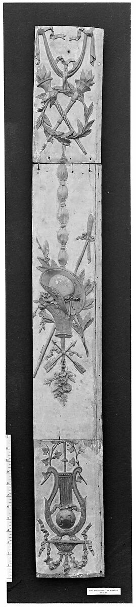 Carved with the lyre of Apollo and ivy branches, a trophy of gardening tools, as well as a foliated wreath intertwined with flaming torches, this panel, composed of three parts, was part of the interior decoration of the apartment of the comtesse d‘Artois at Versailles. In 1773 Marie-Thérèse of Savoy married the grandson of Louis XV (and younger brother of the future Louis XVI) the comte d’Artois. The following year her first floor (American second floor) apartment in the Midi Wing of the palace was renovated to include a small library on the mezzanine level. Jules Hugues Rousseau and his younger sibling Jean-Siméon, who were decorative painters as well as carvers, were responsible for the delicate carving of the paneling in this room.