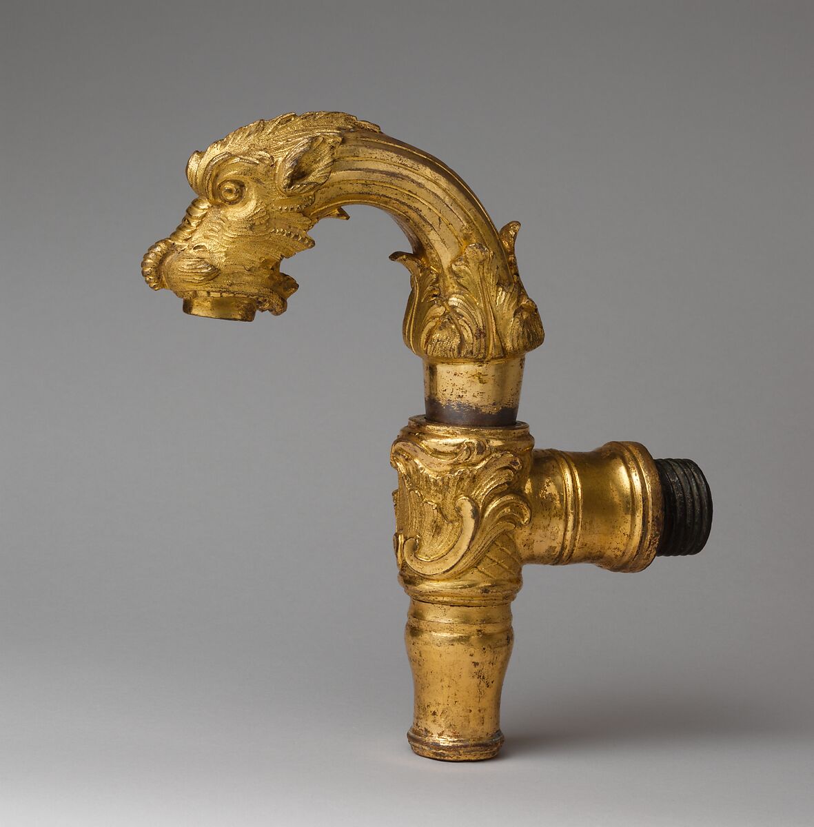 Illustrating yet another use for gilt bronze in the interior, this faucet consists of a nozzle that is decorated with foliate scrolls and a trelliswork pattern dating it to the second quarter of the eighteenth century. Its handle, also serving as a valve, terminates in a dragon’s head.