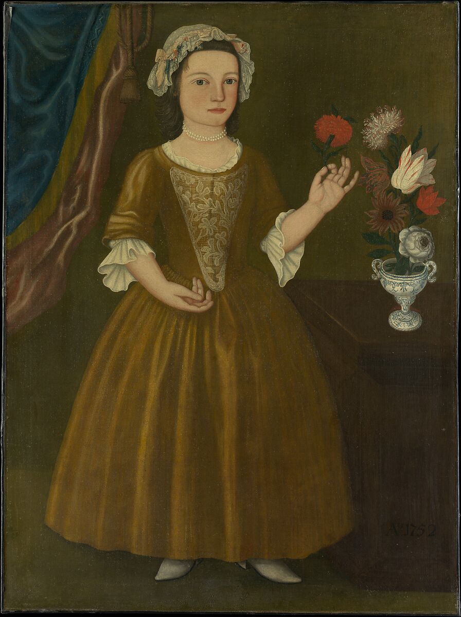 Catherina Elmendorf (b. 1747) was a daughter of Petrus Edmundus Elmendorf (1715–1765) and Mary Crooke (b. 1721) of Kingston, New York. The artist, who remains unidentified, carefully delineated key aspects of the sitter’s clothing and surroundings. Pinned to Catherina’s bodice is an intricate lace stomacher, and she holds a red carnation in her left hand. Her right hand is cupped upward in a gesture of receiving.