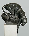 Huntington was one of the most prominent animal sculptors of the early twentieth century, celebrated for her keen powers of observation. “Reaching Jaguar” and its companion piece, “Jaguar” (26.85.2), were based on Huntington’s studies of Señor Lopez, a jaguar from Paraguay who was the first feline occupant of the Lion House at the Bronx Zoo. Stone versions of the pair are installed as gateposts at the zoo. The powerful effect of “Reaching Jaguar” derives from the attenuated, muscular form and the illusion that the stealthy feline is about to pounce from its rocky outlook.