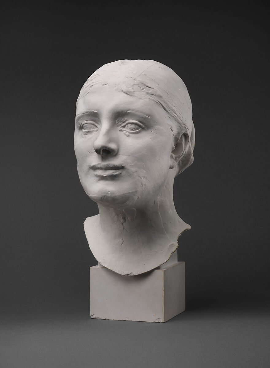 This plaster cast of a study of Mariana Russell’s head is one of several works that Rodin donated to The Met in 1912. It resembles The Met's 1888 portrait in bronze (1986.37.3), and Rodin probably made it in preparation for one of the classicizing sculptures for which she modeled. The head’s straight alignment accentuates the angular features that the artist admired in his sitter, and its matte surface evokes a marble carving.