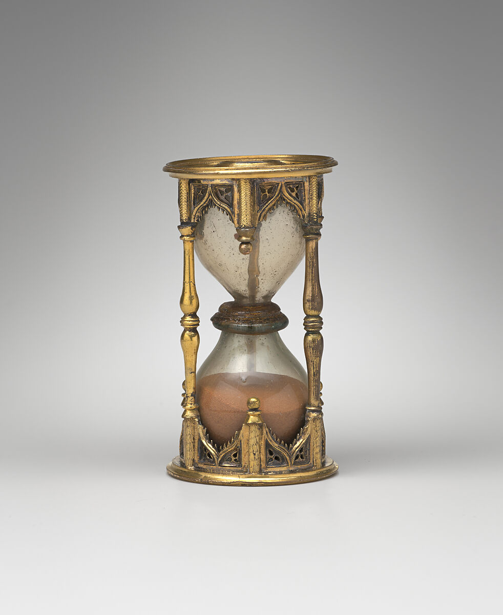 Considerably cheaper and more durable than clocks, sandglasses also required no maintenance. This finely wrought example for the highest end of the market was probably intended for devotional purposes. It would prompt its user not only to reflect on the passing of time and the transience of life but also, more practically, to time half-hour periods of prayer and meditation. Nuremberg became a center of sandglass production, uniting new glass technologies, local metalworkers, and a ready source of particularly fine reddish sand from the nearby village of Weissenbrunn.