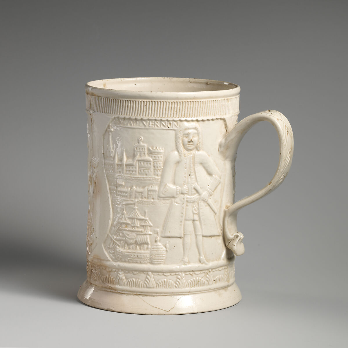 The molded decoration on this mug commemorates the British naval victory by Admiral Edward Vernon over the Spanish fleet at Porto Bello in 1739.