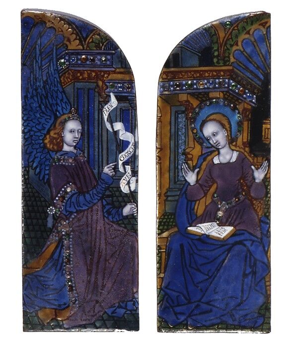 Pénicaud’s name and the date 1503, once (but no longer) visible on an enameled Crucifixion in the Musée National du Moyen Age, Paris, have served to document the enameler’s style. The figure of the archangel Gabriel on the left plaque was probably based on an engraving by Martin Schongauer (ca. 1430–1491), but the facial style and gravity of expression are Pénicaud’s.