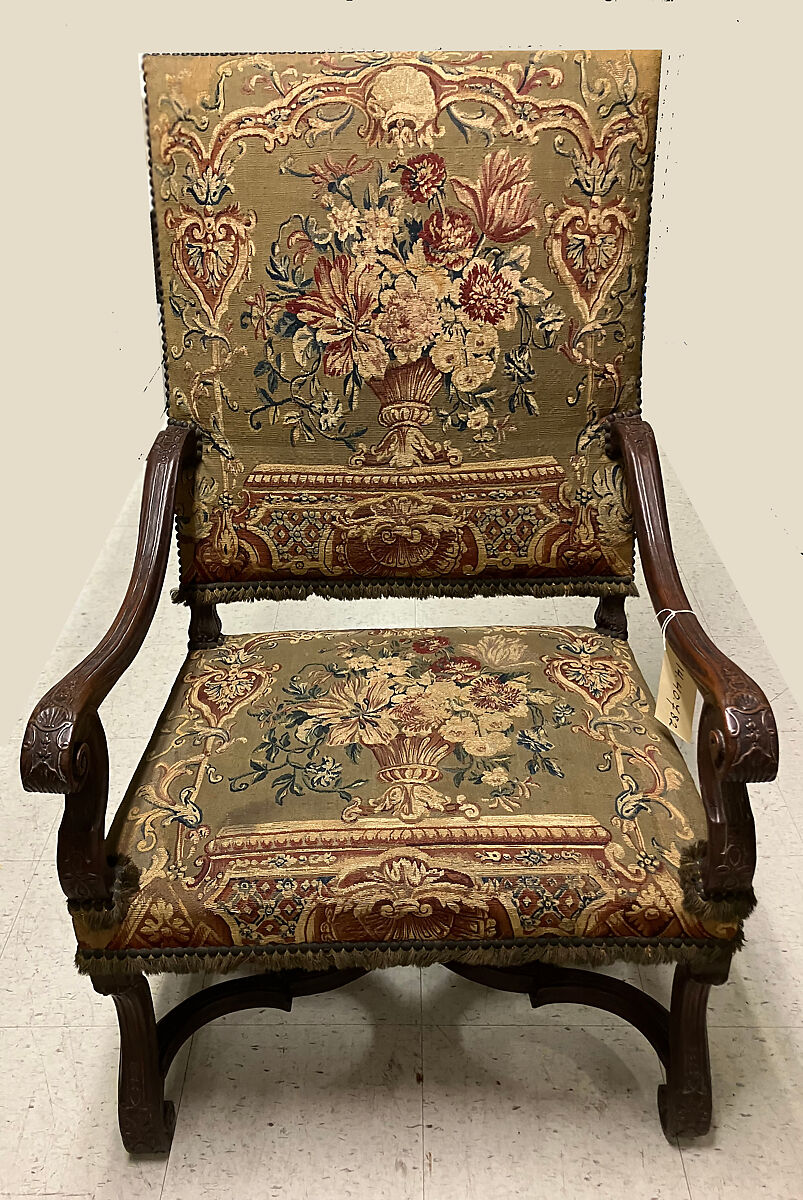 - Medium:Carved walnut; wool and silk tapestry covers, probably Beauvais (not original to the frame)
