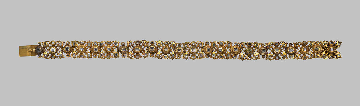 The elegantly detailed engraved ornament on the interior of the gold links identifies this as Spanish work.