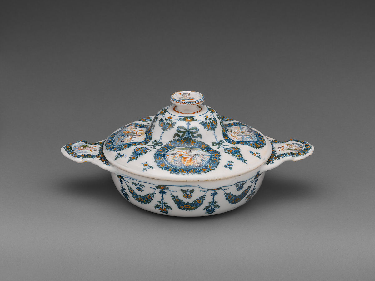 Faience, or tin-glazed and enameled earthenware, first emerged in France during the sixteenth century, reaching widespread usage among elite patrons during the seventeenth and early eighteenth centuries, prior to the establishment of soft-paste porcelain factories. Although characterized as more provincial in style than porcelain, French faience was used at the court of Louis XIV as part of elaborate meals and displays, with large-scale vessels incorporated into the Baroque garden designs of Versailles. Earlier examples of French faience attest to the strong influence of maiolica artists from Italy. Later works demonstrate the ways in which cities such as Nevers, Rouen, Lyon, Moustiers, and Marseille developed innovative vessel shapes and decorative motifs prized among collectors throughout Europe.