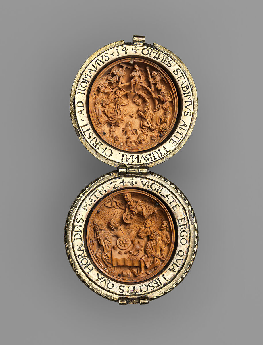 Rendered in virtuoso detail, this rosary bead juxtaposes images of life and death. The boxwood bead opens to reveal Death appearing unannounced at a meal beneath an image of the Last Judgment in the upper hemisphere. The Latin inscription reads, "Stay awake, for you do now know at which hour your Lord will come" (Matthew 24:42).