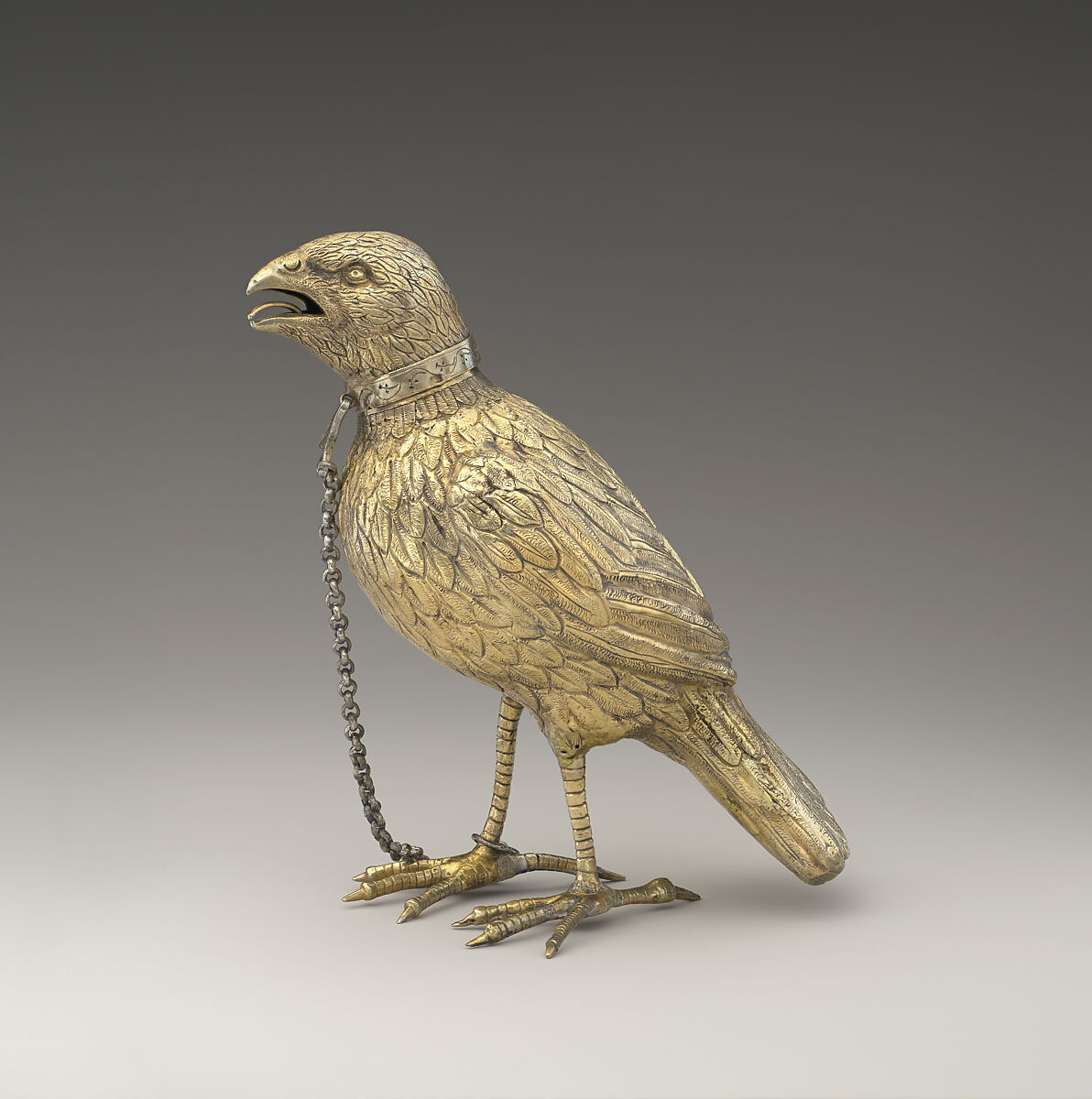 Hunting and falconry were central to aristocratic life, and cups in the form of game animals or pets were popular tableware for court banquets and their associated rituals. Sometimes known as Wilkomm cups, their removable heads could be filled with wine or spirits and offered to guests in greeting, who would then finish their contents in one gulp. Banqueting was important in other institutional settings too, making Wilkomm cups essential accoutrements for town, city, and guild officials.