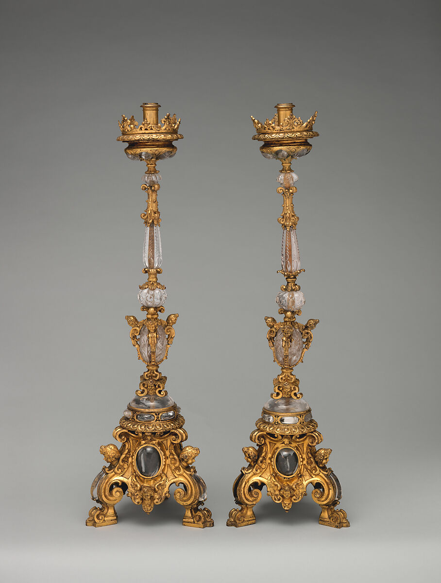 These candlesticks were probably made for a church altar. The pair entered The Met with the donation of J. Pierpont Morgan in 1917 but seem never to have been on view. They were previously dated to the eighteenth century, however the style and materials point to an earlier date, possibly the second decade of the seventeenth century. The combination of rock crystal and gilt bronze was common in Italian production of metal religious objects in the early seicento. Here, the ornate rock crystal and the cherubs, their hair adorned with small flowers, recall the decorative output of Stefano Maderno and his workshop. Maderno was a prominent sculptor and gifted metalworker in Rome at the beginning of the seventeenth century.[1] The candlesticks could have been designed and then cast in one of the numerous goldsmiths’ shops active around the 1610s, after the completion of the monumental ciborium in the Sistine Chapel in the Basilica of Santa Maria Maggiore and the high altar of Santa Cecilia in Trastevere, where many sculptors and goldsmiths jointly produced lavish decorations under Maderno’s supervision.