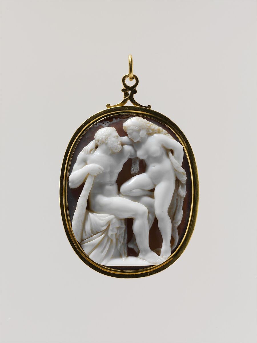In this bold late Baroque design, whose curvilinear forms are enunciated with admirable clarity, the sexual roles of Hercules and Omphale (whom we encountered in stately profile format in 38.150.14) are reversed: Omphale excitedly assumes the hero’s lion-skin mantle, her leg nudging his, while he sinks into sedentary torpor.