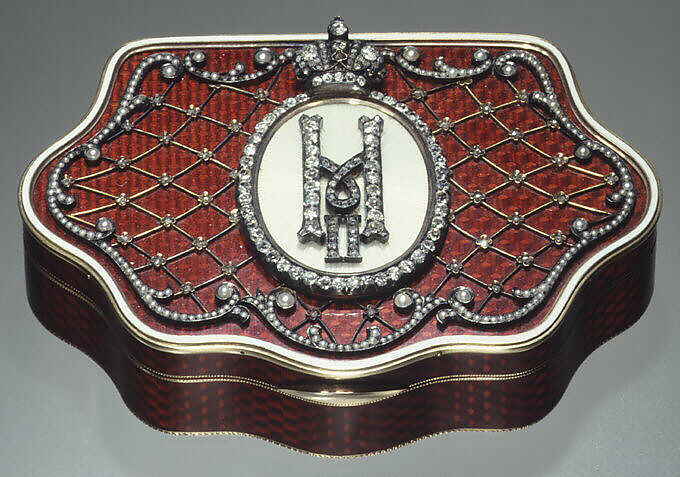 Sparkling diamonds and bold red enamel create a luminous backdrop, highlighting the central oval under the imperial crown with the Cyrillic cipher of Czar Nicholas II (1868–1918). The box was likely a gift of the imperial household or government to reward