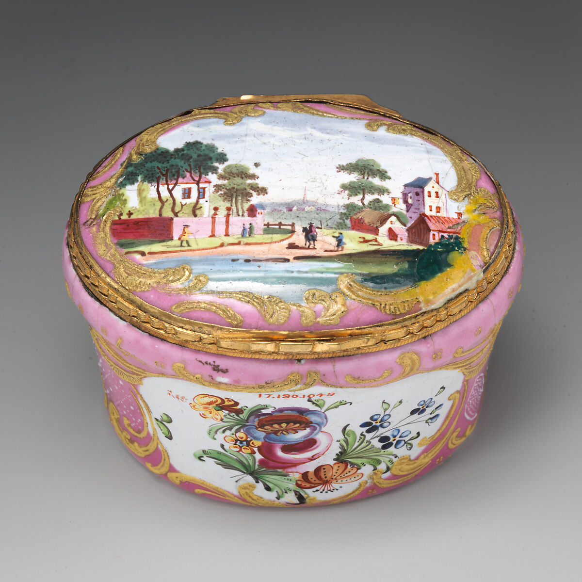 Enameled objects like this one, intended to imitate the lustrous quality of porcelain, were among the more affordable goods sold at toyshops across London and in fashionable English resort towns. Though often called "Battersea enamels" in common parlance (referring to the manufactory at York House, Battersea, operating only between 1753 and 1756), we rarely know exactly where individual pieces were made. The main centers of enamel production were in London, South Staffordshire (particularly in Bilston and Wednesbury), and Birmingham.