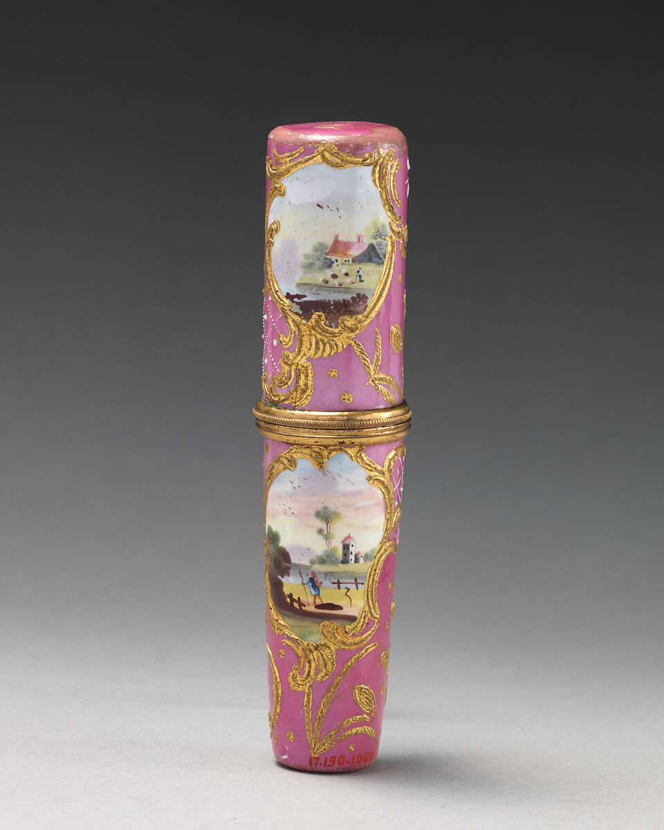 Enameled objects like this one, intended to imitate the lustrous quality of porcelain, were among the more affordable goods sold at toyshops across London and in fashionable English resort towns. Though often called "Battersea enamels" in common parlance (referring to the manufactory at York House, Battersea, operating only between 1753 and 1756), we rarely know exactly where individual pieces were made. The main centers of enamel production were in London, South Staffordshire (particularly in Bilston and Wednesbury), and Birmingham.