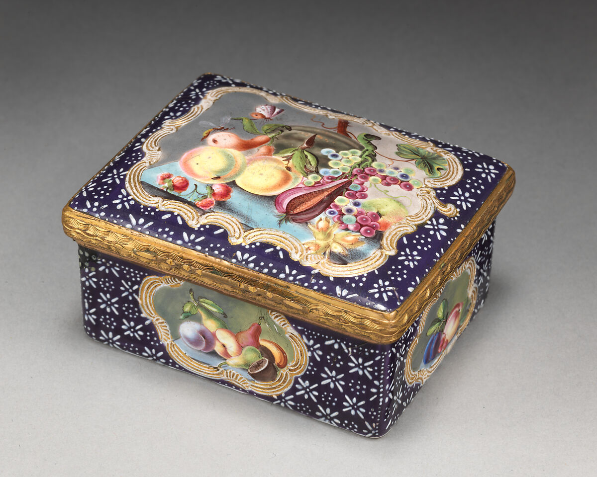 Enameled objects like this one, intended to imitate the lustrous quality of porcelain, were among the more affordable goods sold at toyshops across London and in fashionable English resort towns. Though often called "Battersea enamels" in common parlance (referring to the manufactory at York House, Battersea, operating only between 1753 and 1756), we rarely know exactly where individual pieces were made. The main centers of enamel production were in London, South Staffordshire (particularly in Bilston and Wednesbury), and Birmingham.