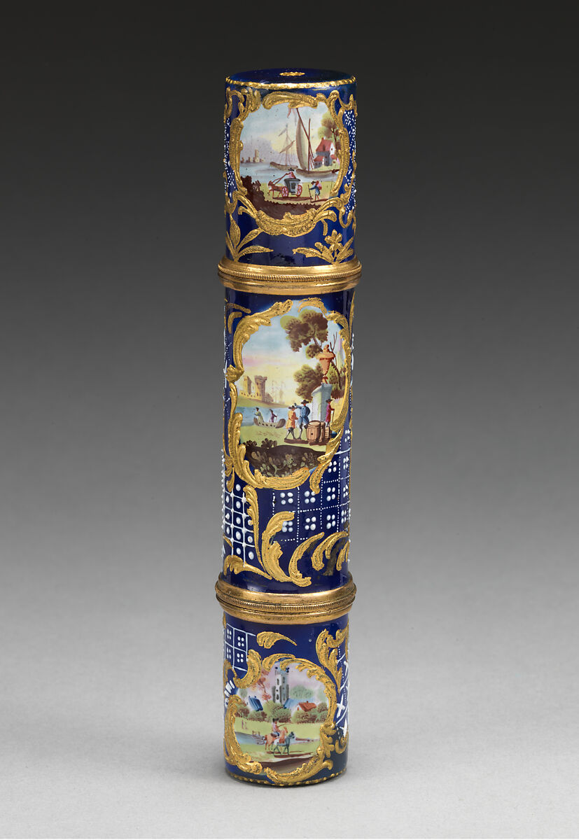 Enameled objects like this one, intended to imitate the lustrous quality of porcelain, were among the more affordable goods sold at toyshops across London and in fashionable English resort towns. Though often called "Battersea enamels" in common parlance (referring to the manufactory at York House, Battersea, operating only between 1753 and 1756), we rarely know exactly where individual pieces were made. The main centers of enamel production were in London, South Staffordshire (particularly in Bilston and Wednesbury), and Birmingham.