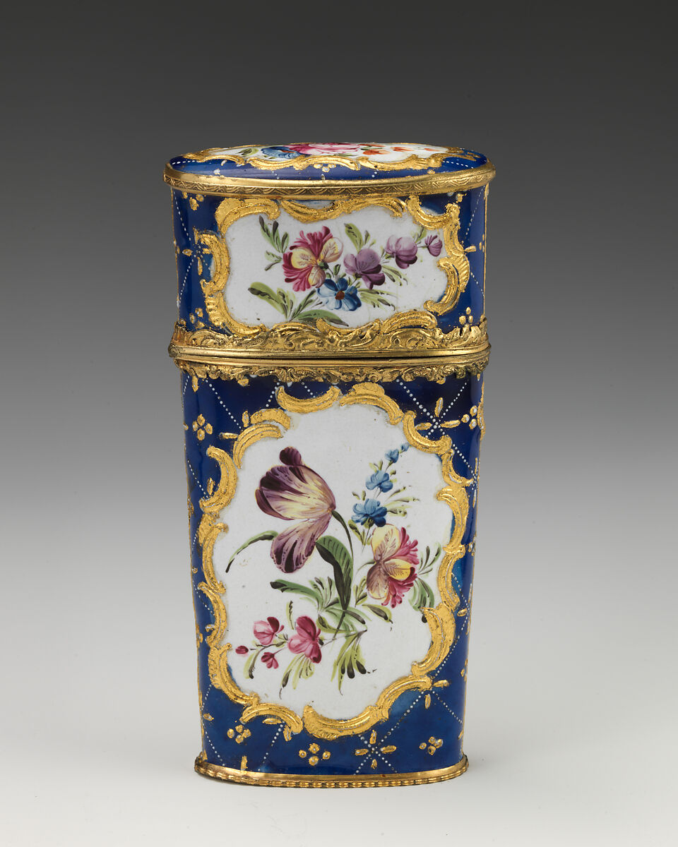 Enameled objects like this one, intended to imitate the lustrous quality of porcelain, were among the more affordable goods sold at toyshops across London and in fashionable English resort towns. Though often called "Battersea enamels" in common parlance (referring to the manufactory at York House, Battersea, operating only between 1753 and 1756), we rarely know exactly where individual pieces were made. The main centers of enamel production were in London, South Staffordshire (particularly in Bilston and Wednesbury), and Birmingham.
