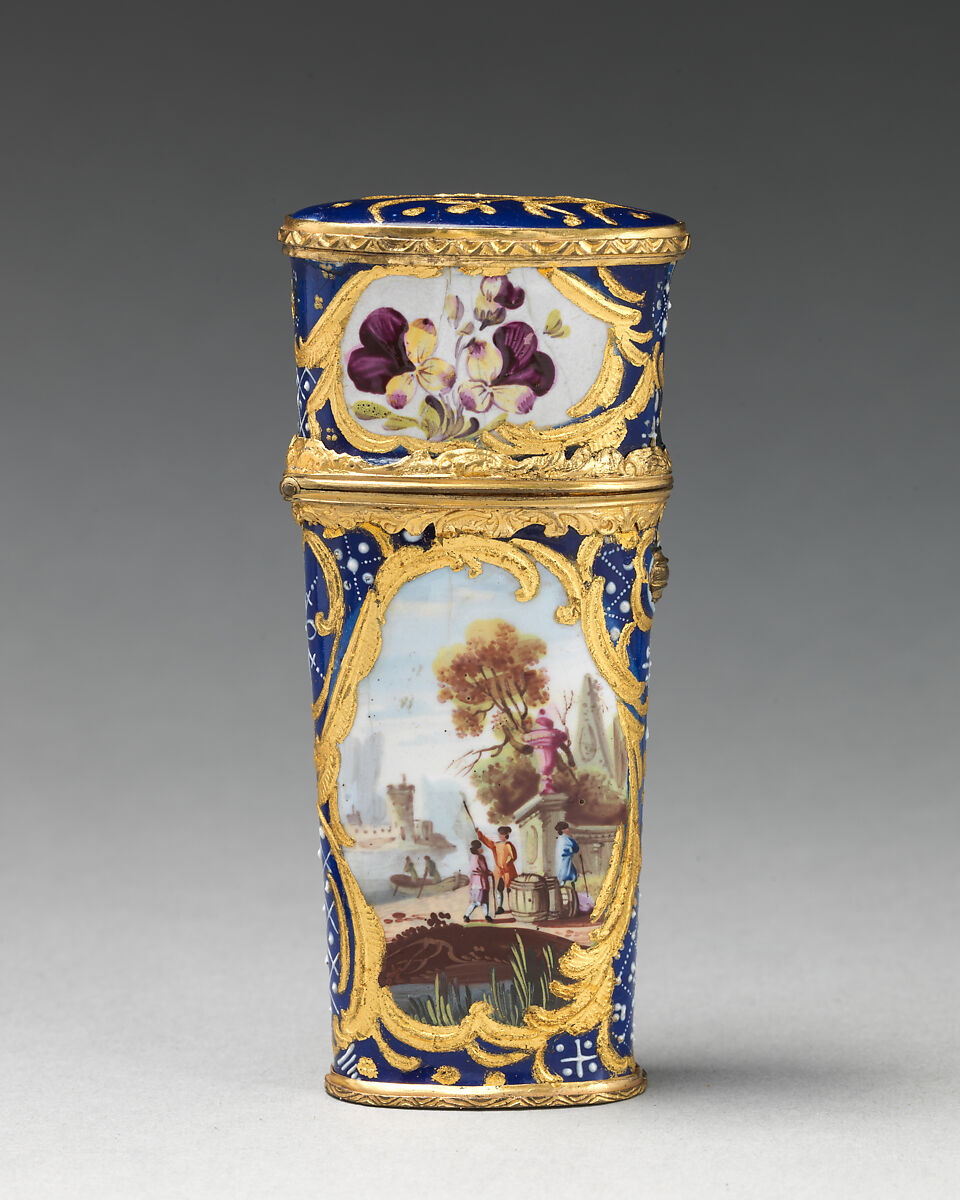 Enameled objects like this one, intended to imitate the lustrous quality of porcelain, were among the more affordable goods sold at toyshops across London and in fashionable English resort towns. Though often called "Battersea enamels" in common parlance (referring to the manufactory at York House, Battersea, operating only between 1753 and 1756), we rarely know exactly where individual pieces were made. The main centers of enamel production were in London, South Staffordshire (particularly in Bilston and Wednesbury), and Birmingham.