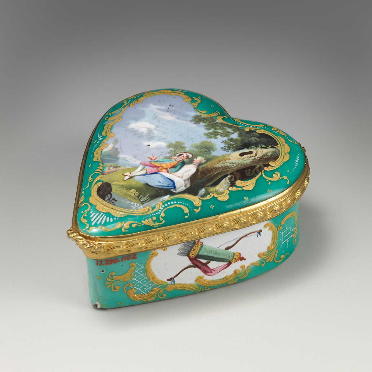 The love-themed decoration of this rare heart-shaped box—a couple in a pastoral landscape on the lid, flaming hearts and a bow and quiver full of arrows on the sides—suggests that it was intended to be given as a romantic gift.
