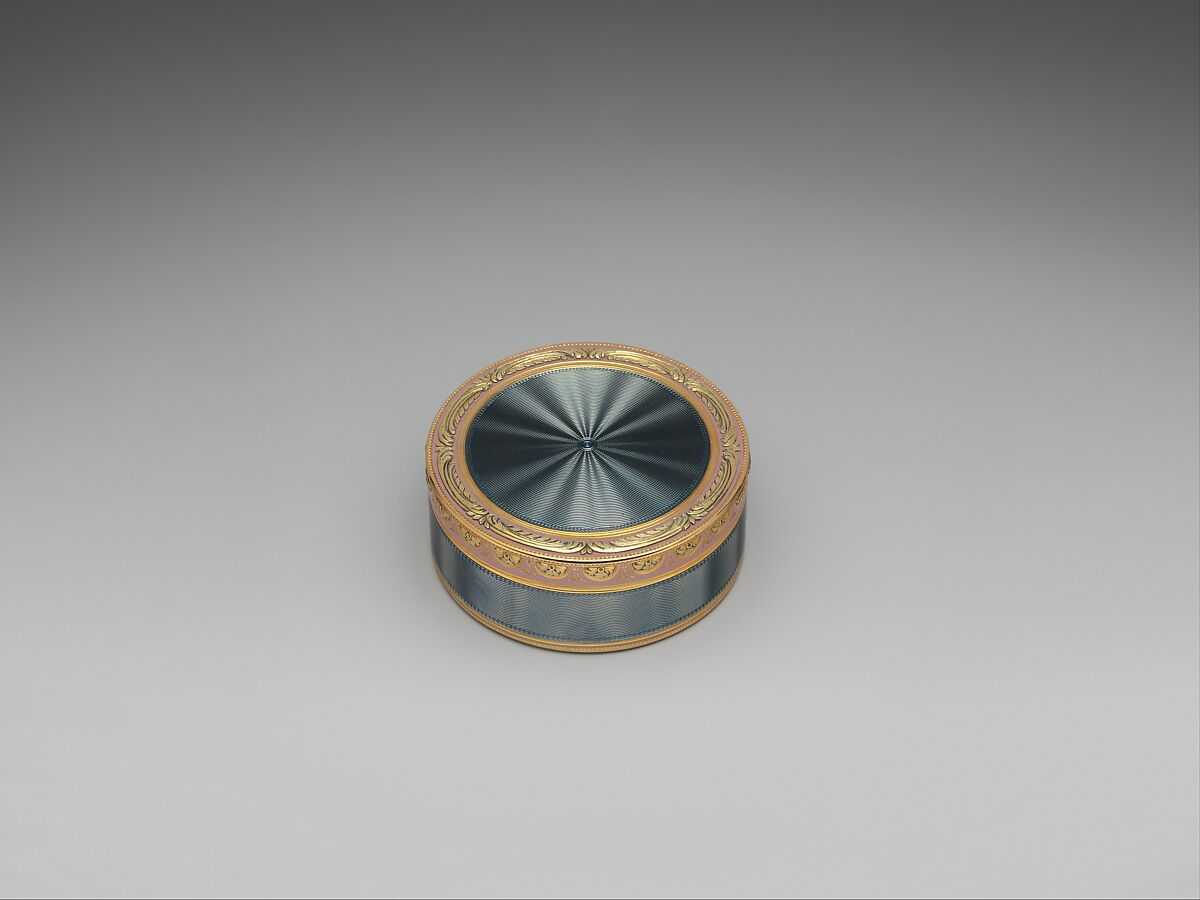The translucent bluish gray enamel was applied over an engine-turned ground, a technique that was favored for the decoration of gold boxes during the 1770s and 1780s. Creating dramatic decorative effects, the translucent enamel contrasts with the pink opaque enamel used on the rims.