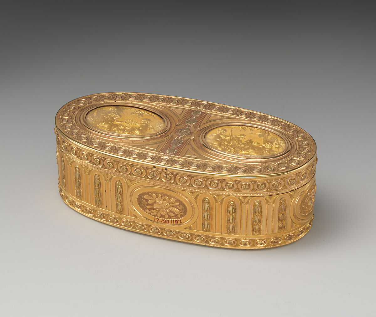 In eighteenth-century Europe, Paris led the production of high-quality luxury goods. Parisian goldsmiths made a wide range of small, personal articles such as snuffboxes; étuis to hold sealing wax, tweezers, or utensils for sewing; souvenirs, which contained thin ivory tablets for note taking; and shuttles for knotting lace. Gold snuffboxes and boxes decorated with portrait miniatures were prized and frequently given as royal gifts, often to ambassadors or members of the court in lieu of cash payments for their services. Coveted and admired, these boxes were produced from a variety of materials. The best were skillfully made of gold and embellished with diamonds, enameled decoration, lacquer, and other luxurious materials. By the middle of the century, the taking of snuff had become an entrenched social ritual, and the snuffbox, too, had become an important social prop. Snuffboxes were considered highly fashionable accessories, with some merchants advertising new boxes with each change of season. The popularity of snuffboxes extended to all levels of society, and for those who could not afford gold, boxes were produced in less expensive materials such as silver, tortoiseshell, porcelain, or domestically produced lacquer.