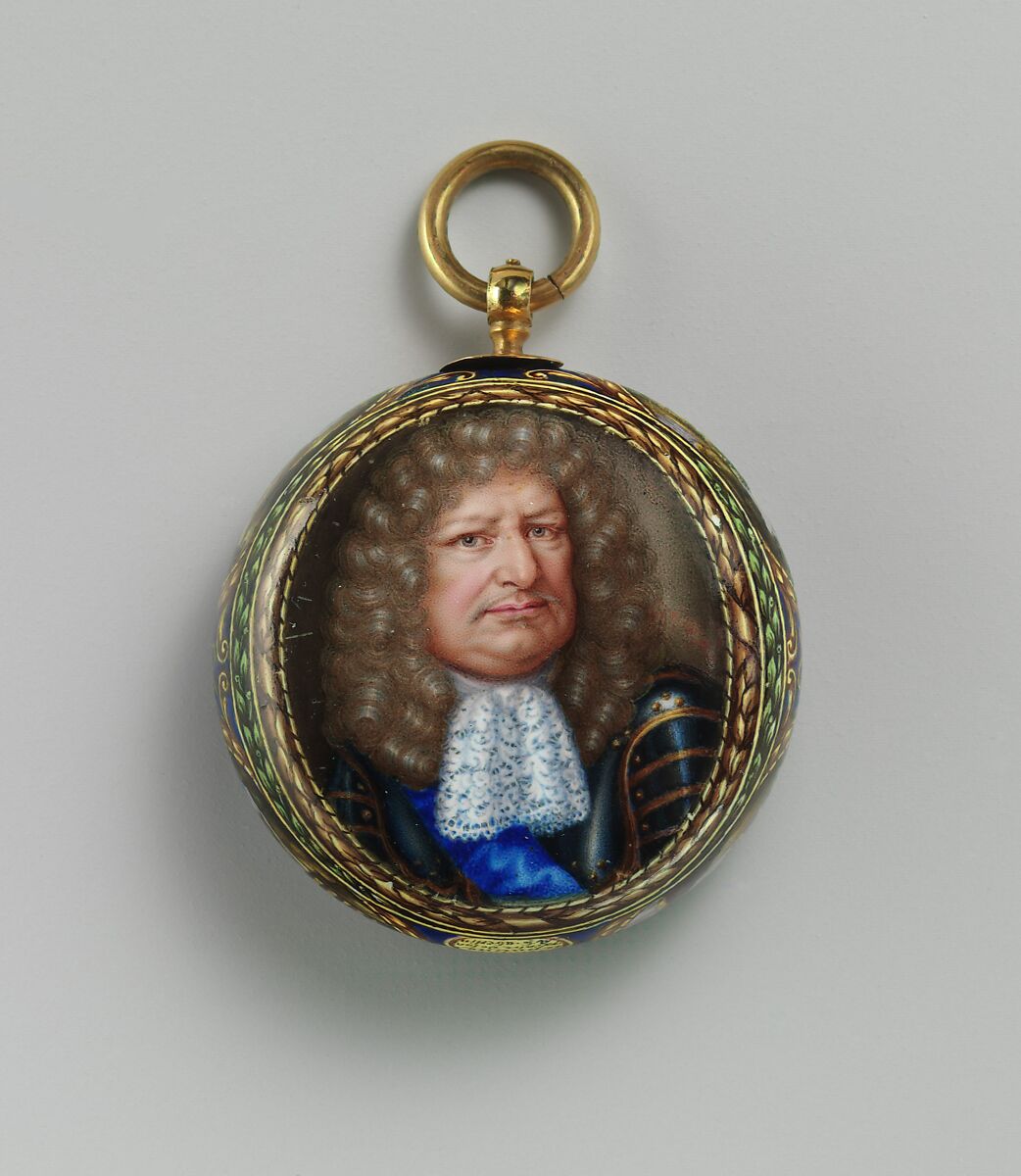 The portrait on the Museum’s watchcase records a stout man of late middle age who looks out at the viewer somewhat warily. He wears a full-bottomed wig and military armor with a splendid lace cravat. This image was adapted from a half-length portrait by Gedeon Romandon (1667– 1697), which is now in the Schloss Caputh, near Potsdam, Germany, the former country estate that belonged to Friedrich Wilhelm’s second wife, Dorothea, daughter of Philip, Duke of Holstein-Glücksburg. As Romandon is thought to have arrived in Berlin only a year or two before the Great Elector died,[18] the painting probably reflects the effects of the ill health that preceded his death in 1688.