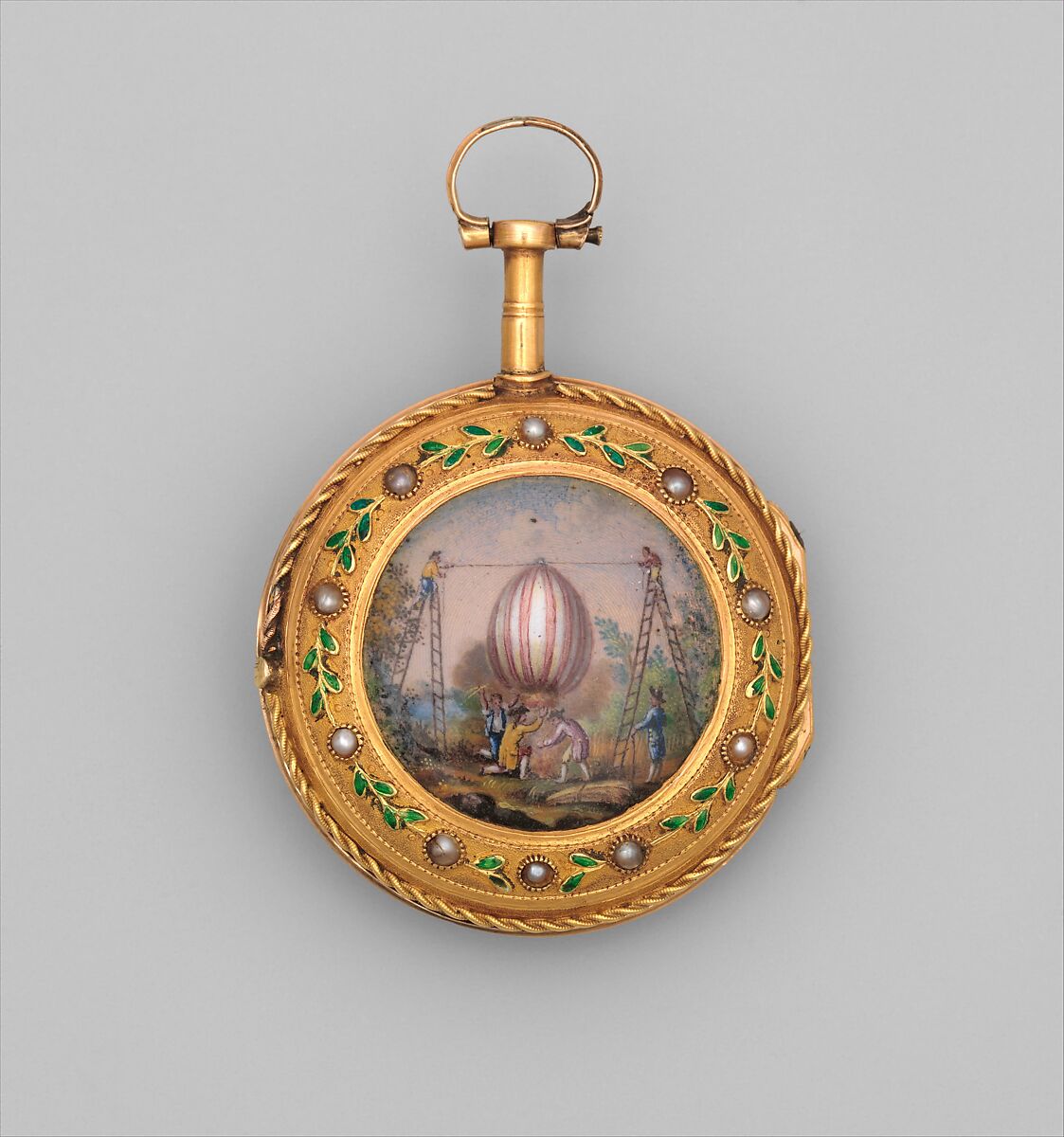 The Museum’s watch, although a more modest novelty, nevertheless demonstrates how great early attempts at human flight captured the French imagination. In the enameled scene on the back of the Museum’s watchcase, two men precariously perched atop ladders secure a balloon, which is about to be launched by three men on the ground. One of the three men wields a lighted torch that identifies the balloon as a true montgolfiere, the French word for a hot-air balloon.
