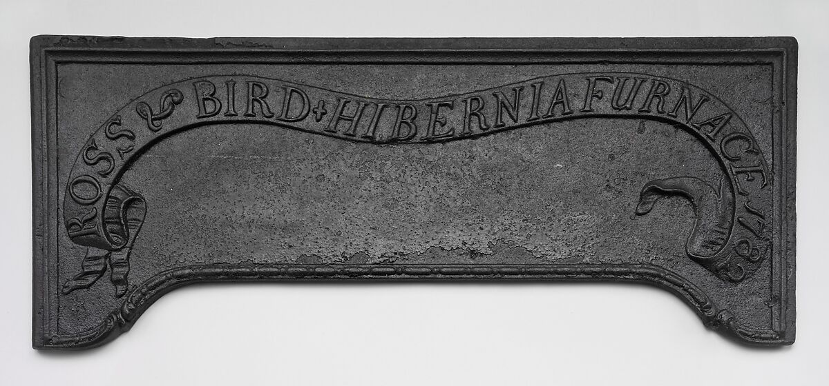 Firebacks and single plates from stoves are about all that survive to remind us of the great iron foundries of New Jersey and eastern Pennsylvania that were part of the largest industry in colonial America. The ornamental plates, though of the basest of metals, were cast from mahogany patterns, the handiwork of the best furniture carvers. Early examples were decorated with biblical quotations and static arrangements of hearts and tulips that followed German precedents (47.137.10). Plates made after 1770 and decorated with the playful naturalistic motifs of the English rococo, dismissed as decadent by early twentieth-century collectors, are now exceedingly rare. This plate, without foliage, features a ribbon-like banner inscribed "ROSS & BIRD + HIBERNIA FURNACE 1782." George Ross and Mark Bird Jr., leading entrepreneurs in the Pennsylvania iron business, operated the Hibernia Furnace in Morris County, New Jersey, in the 1780s.
