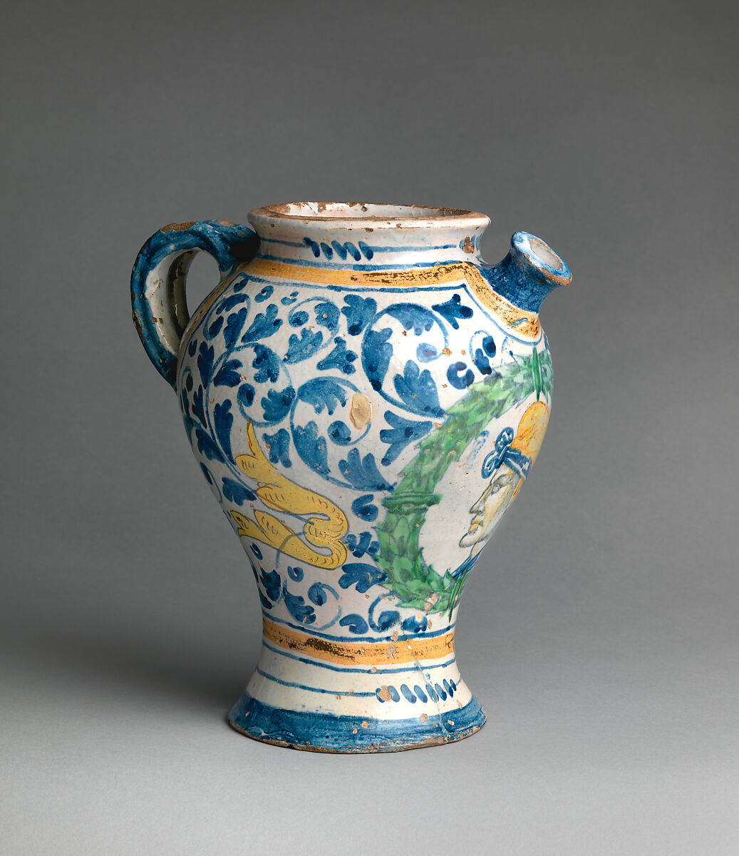 Adorned with the profile likeness of a man encircled by a laurel wreath, this short-necked jug is of a type used in apothecary shops to store syrups, oils, and other liquid medications that could be easily dispensed from the spout.