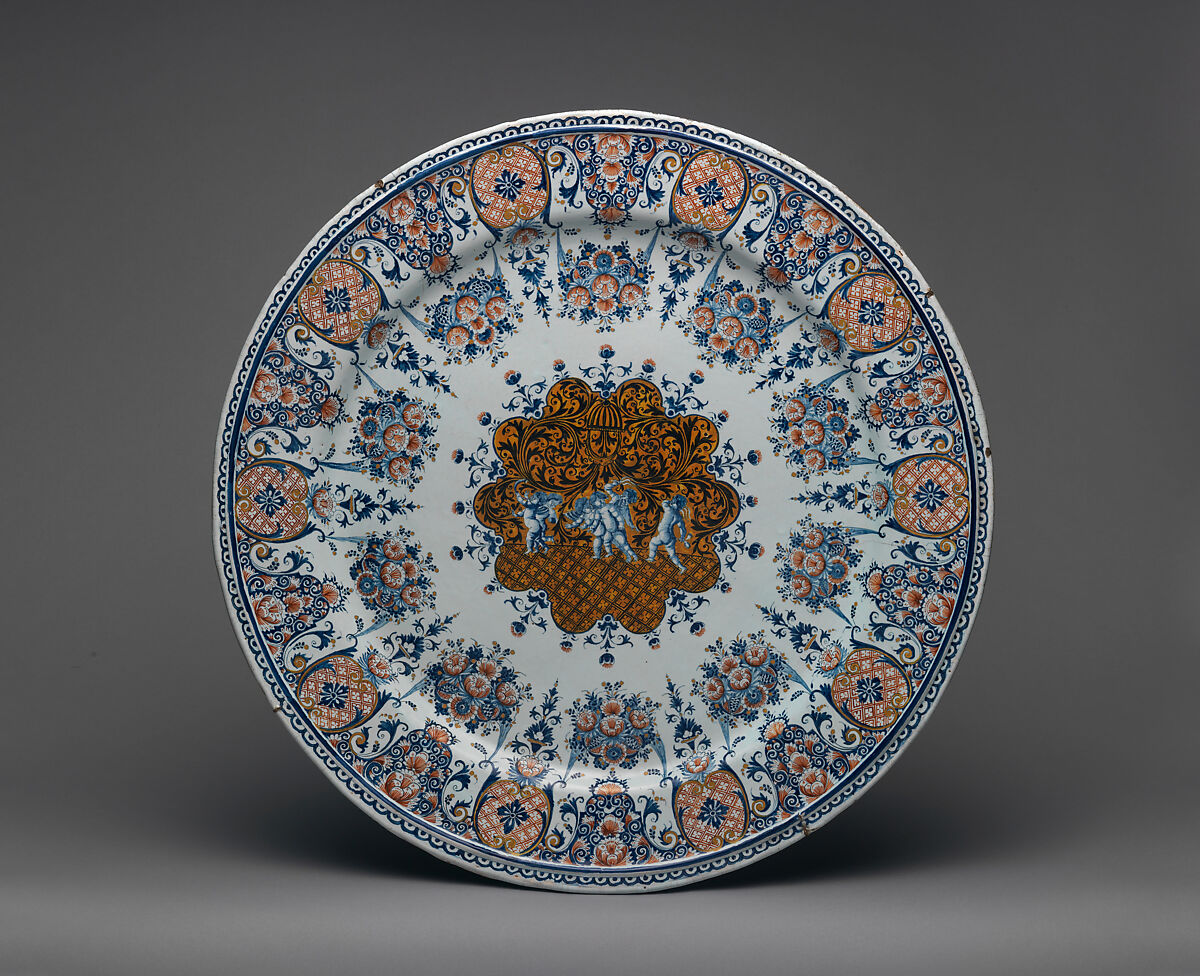 Faience, or tin-glazed and enameled earthenware, first emerged in France during the sixteenth century, reaching widespread usage among elite patrons during the seventeenth and early eighteenth centuries, prior to the establishment of soft-paste porcelain factories. Although characterized as more provincial in style than porcelain, French faience was used at the court of Louis XIV as part of elaborate meals and displays, with large-scale vessels incorporated into the Baroque garden designs of Versailles. Earlier examples of French faience attest to the strong influence of maiolica artists from Italy. Later works demonstrate the ways in which cities such as Nevers, Rouen, Lyon, Moustiers, and Marseille developed innovative vessel shapes and decorative motifs prized among collectors throughout Europe.