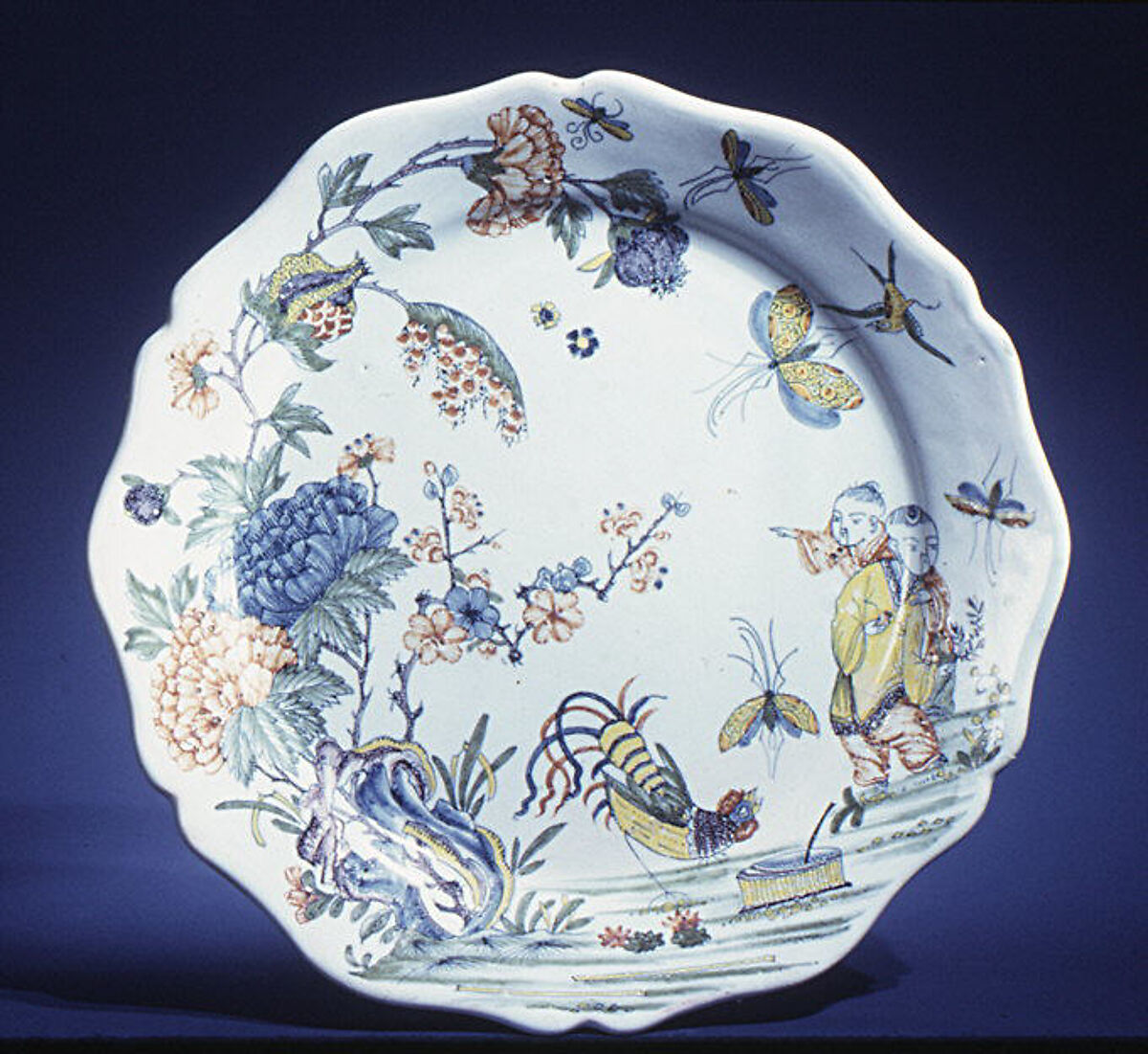 Faience, or tin-glazed and enameled earthenware, first emerged in France during the sixteenth century, reaching widespread usage among elite patrons during the seventeenth and early eighteenth centuries, prior to the establishment of soft-paste porcelain factories. Although characterized as more provincial in style than porcelain, French faience was used at the court of Louis XIV as part of elaborate meals and displays, with large-scale vessels incorporated into the Baroque garden designs of Versailles. Earlier examples of French faience attest to the strong influence of maiolica artists from Italy. Later works demonstrate the ways in which cities such as Nevers, Rouen, Lyon, Moustiers, and Marseille developed innovative vessel shapes and decorative motifs prized among collectors throughout Europe.