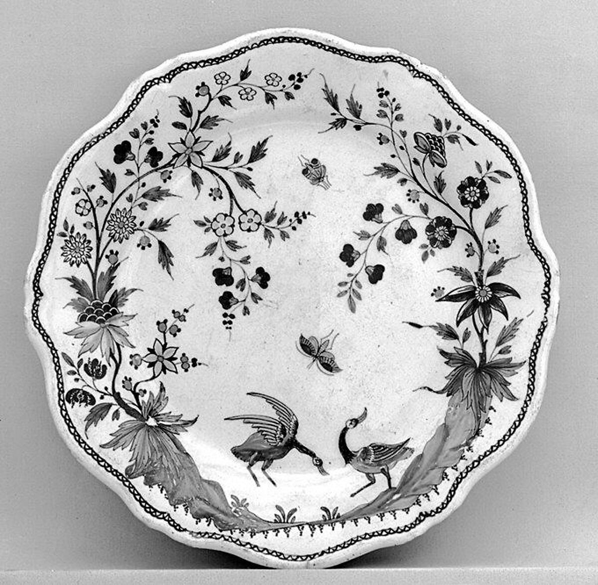 While faience can be created from a wide mixture of clays, it is foremost distinguished by the milky opaque white color achieved by the addition of tin oxide to the glaze. French faience is typically divided into two types. Grand feu (high fire) describes pieces that have been decorated with glaze and metallic oxides before being fired a single time at a high temperature of around 1650°F (900°C). Petit feu (low-fire) faience, developed in the second half of the eighteenth century, refers to a process whereby the clay body is fired before being glazed and decorated with metallic oxides and then fired again at a lower temperature; pieces can also go through a third firing. Grand feu pieces have a more limited color palette that consists of blue, yellow, brown-purple, and green. By contrast, the lower firing temperature of petit feu faience enabled both greater precision in painting techniques and variety in the range of colors.