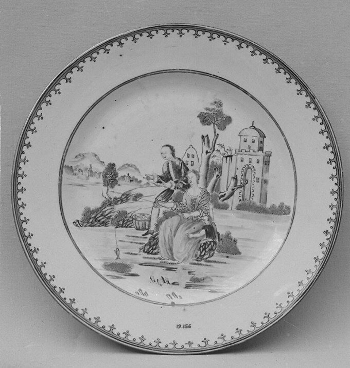 The scene on this plate appears to be free copy of an engraving by Joseph Wagner (1606–1780), of Jacopo Amigoni's painting "Aqua." In the engraving the scene is placed in a rural setting with architecture, there is no child, and the position of the man is reversed. However, the attitude of the woman and the presence of one or two details, makes the identification with Amigoni reasonable.