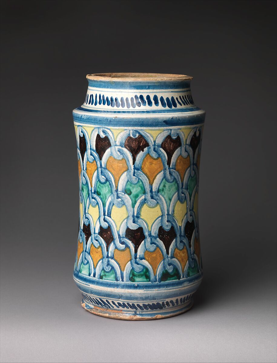 Storage vessels were among the most frequently produced maiolica wares in late medieval and Renaissance Italy. Made in fairly standard shapes, they were designed to fit with dozens of others on a shelf, often in a pharmacy or shop. Their handles therefore tend to fit within the vessel’s profile, and the cylindrical albarello type is generally narrower at the middle than at the top or bottom, making it easy to grip. Other common features include inscriptions indicating contents and flanged lips to help secure cloth or paper seals. The decoration, usually more elaborate on one side than the other, can sometimes link pieces to a known dispensary or specific workshop or artist.