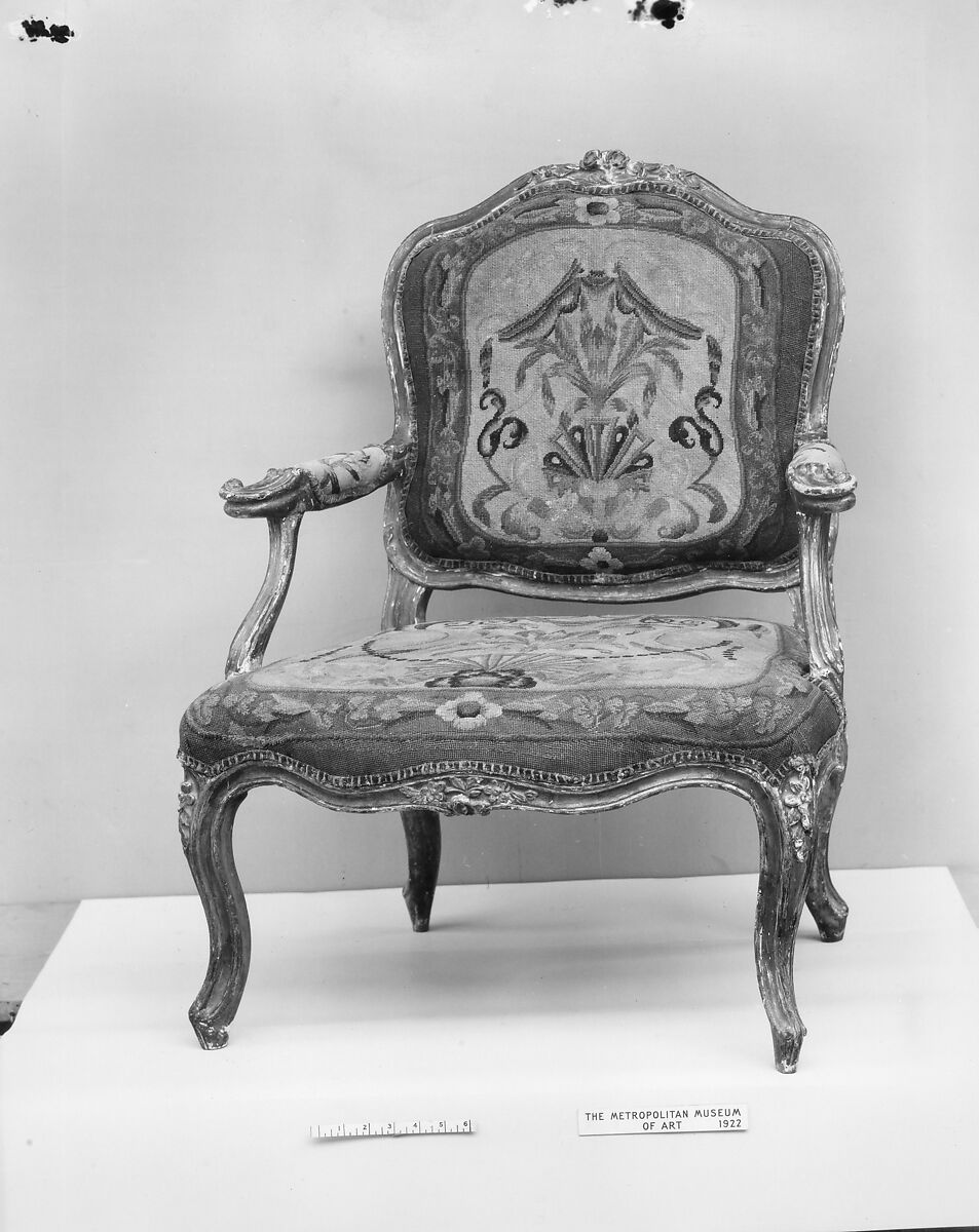 - Medium: Walnut, painted and silvered; wool petit point embroidery